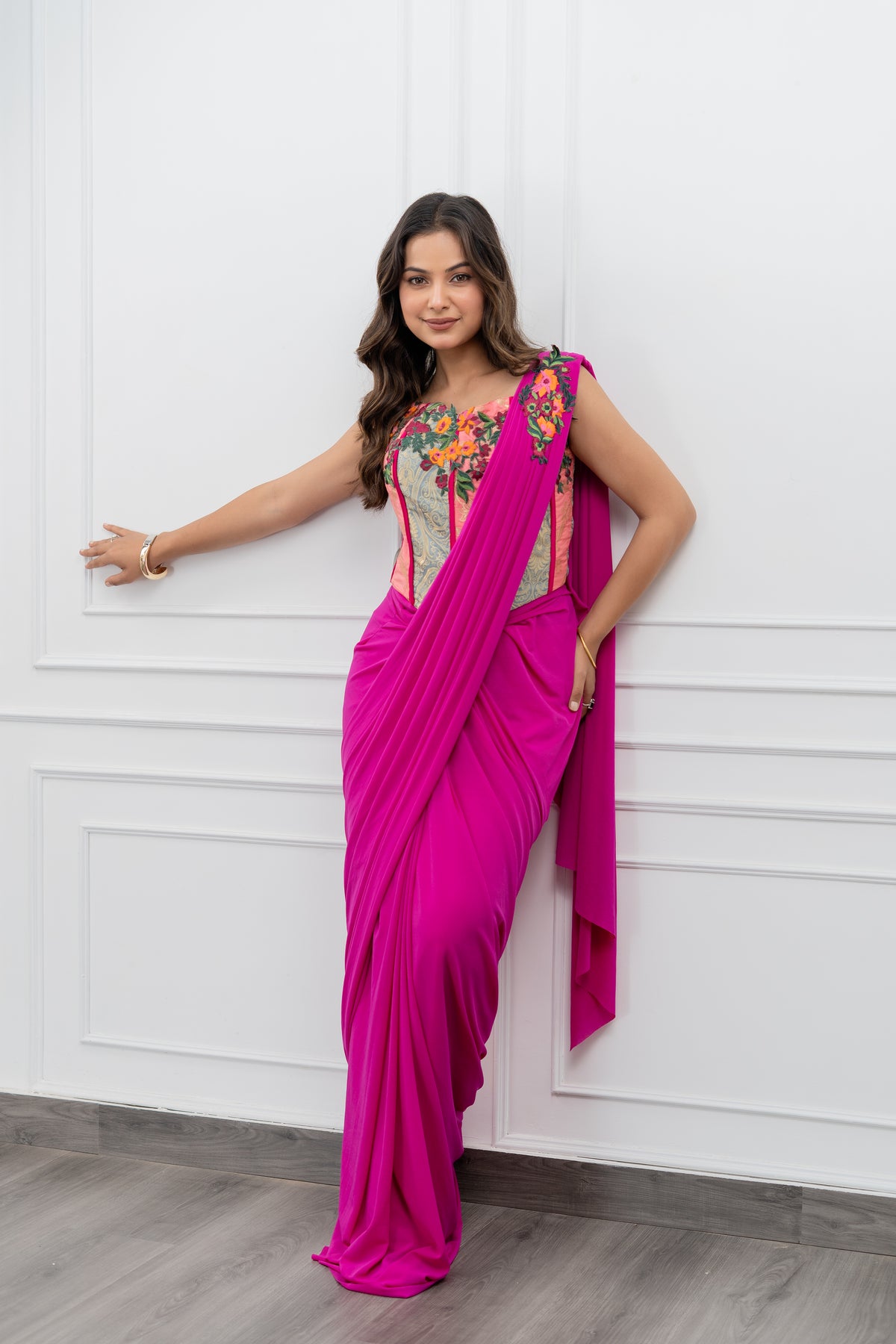 Radiate timeless elegance with our Fuchsia Bloom Pre-Draped Saree Ensemble, a modern expression of classic Indian grace. Crafted in a striking magenta-fuchsia hue, this effortlessly chic saree is pre-draped for comfort and convenience, making it perfect for today’s confident, contemporary woman.