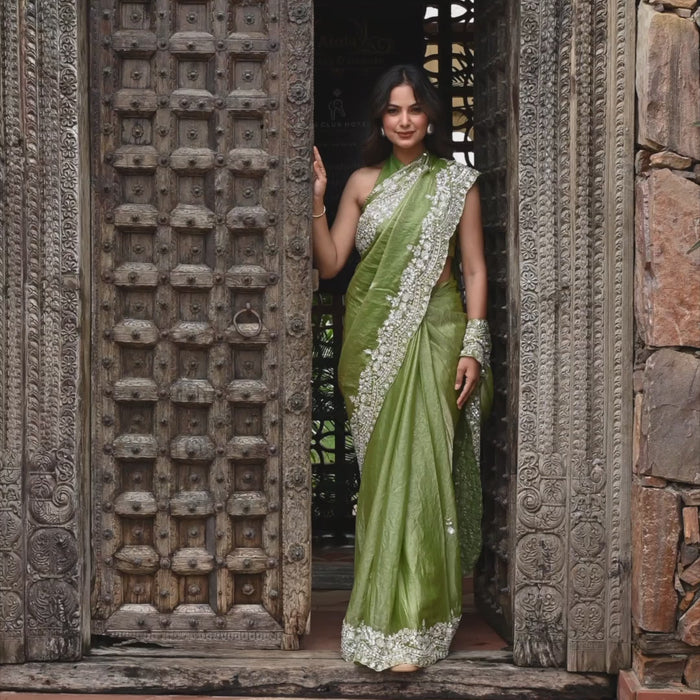Lush Green: Vibrant green drape enhanced with delicate floral threadwork and shimmer embroidery, offering a refreshing festive aura.