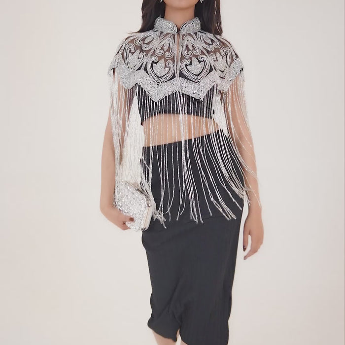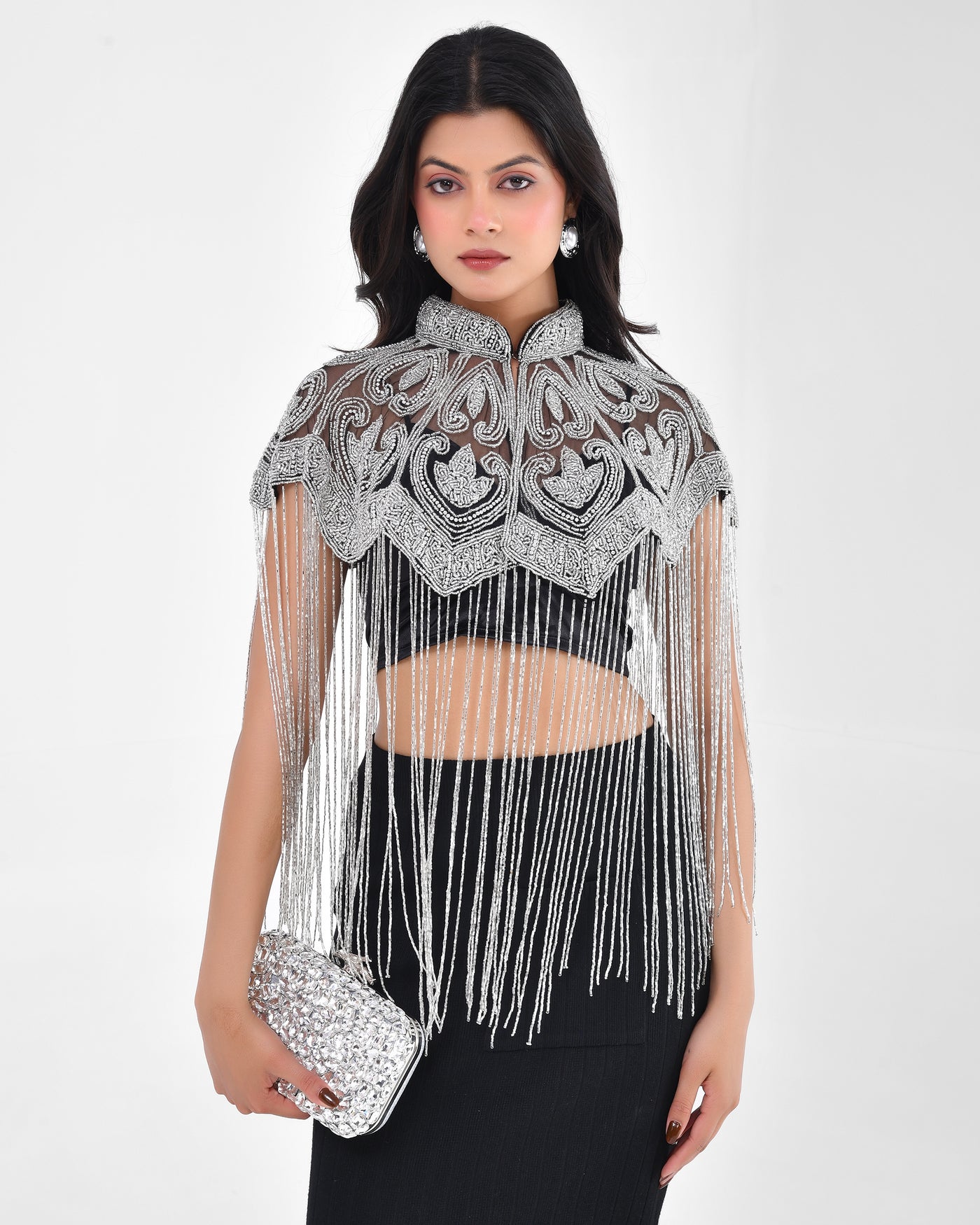 The Silver Swan Fringe Cape ,is a statement piece that blends elegance with modern glamour. Adorned with shimmering silver beads and delicate fringe detailing, it moves beautifully with every step. The graceful silhouette adds a touch of sophistication while maintaining a refined and polished look. Perfect for styling over sarees, gowns, or cocktail ensembles for an elevated evening style